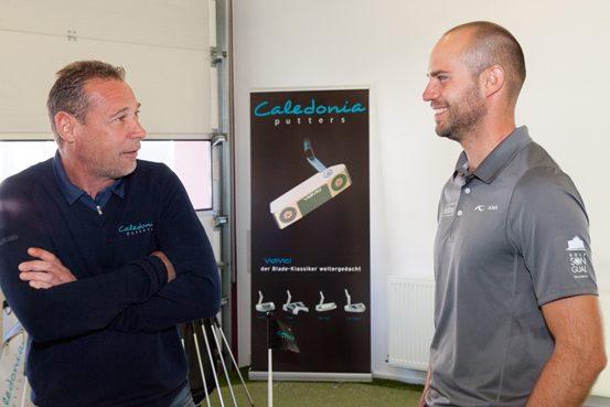 Im Putting Performance Center des positiv golf-verrückten Zahntechnik-Profis und Caledonia-Gründers Claus-Peter Maier, der selbst mindestens so gut puttet wie er „badensert“, war bei unserem Treffen European Tour Player Bernd Ritthammer, 30, zugegen, der sein zehntes Profi-Jahr gerade mit drei Siegen beendet hatte. Sein Bekenntnis: „Auch unter uns Profis ist das Putten immer ein großes Thema, weil wir wissen, dass die Technik immer wichtiger und die Grüns weltweit immer besser werden. Aber ich bin immer wieder erstaunt über die Tatsache, dass die meisten Kollegen im Gegensatz zu allen anderen Schläger ihren Putter nicht fitten lassen und Putter von der Stange nehmen. Vielleicht aus Bequemlichkeit, weil bei jedem Profiturnier so viele Anbieter dabei sind... aber nachdem ich jetzt selbst bei Caledonia erstmals ein Putter-Fitting gemacht habe, weiß ich, wie wichtig all‘ die Parameter sind, die dazu gehören, wie Loft und Lie, Grind und Gewicht, etc. Nicht nur bei den Eisen und Hölzern, auch beim Putter muss alles passen. Mit meinem gefitteten Model Viper fühle ich mich einfach besser und wohler und meine drei Siege 2016 verdanke ich sicherlich auch meiner optimierten Putt-Qualität, denn eine Putt-Verbesserung meines Tour-Durchschnittes von 0,3 bedeutet bei uns Profis Welten! Es geht ja bei uns in erster Linie ums Ausmerzen von möglichst vielen Fehlerquellen ...“