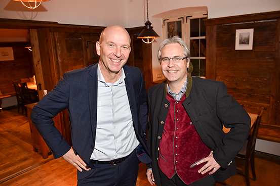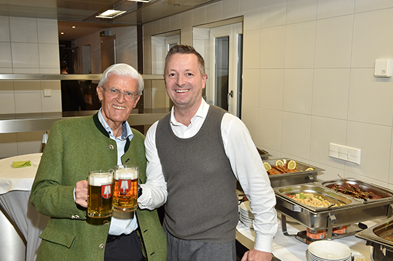 Karl-Heinz Zacher, die Hauseigner Dr. Jobst Kayser-Eichberg sowie deren Vorstände Martin Schuhmacher und Michael Heubach, Andreas Bollow und Dietmar Seiler von der Spatenbrauerei erhielten dafür noch beim Stehempfang in der Küche großen Applaus, u.a. von St. Emmeram-Nachbar und Ex-Hochspringer Carlo Thränhard (der nach 33 Jahren immer noch den deutschen Hallenrekord mit 2,42 m hält und von seinem 22jährigen Sohn Dion begleitet wurde), Sybille Beckenbauer (die eigens aus Kitzbühel kam), der Moderatorin Eva Grünbauer sowie Aston Martin München-Geschäftsleiter Wolfgang Oswald, der als Technik-Fan staunte: „Herrlich: Die Emmeramsmühle schaut innen aus wie früher, aber es ist ein gutes Gefühl, dass hinter der traditionellen bayrischen Gemütlichkeit modernste Technik steckt!“