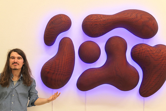Die insgesamt fünf Werke, die er bis zur Ausstellung in der Akademie der Bildenden Künste teilweise über Jahre fertige, sind übrigens erwerblich. Die abgebildete Skulptur unter dem Namen „Bubbles“ besteht aus Lausprecher-Symbolen aus Maschendraht, Licht und Moiré-Effekten.