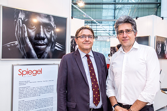 Das Gesicht ist ein Abbild der Seele. Es zeigt, was einen Menschen ausmacht, seine Erinnerungen und Erfahrungen, seine Аngste und Sehnsüchte. All das versucht der italienische Künstler Marco Pejrolo (rechts) in seinen Bildern einzufangen. Insgesamt 47 Flüchtlinge hat er für seine Ausstellung „Spiegel der Seele“, die aktuell am Flughafen München Station macht, portraitiert. „In seinen Schwarz-WeiІ-Fotografien, die die dargestellten Gesichter mit einer unglaublichen Detailschärfe zeigen, hat Marco Pejrolo die Portraitierten auf das Wesentliche reduziert – auf ihr Menschsein“, so der Leiter der Presseabteilung, Ingo Anspach (links), am Eröffnungsabend. „Bei einem Thema, das in den Nachrichten üblicherweise mit anonymen Massen assoziiert wird, zeigt der Künstler damit einen ganz anderen Blickwinkel.“ Die Ausstellung ist ein Interaktionsversuch zwischen dem Betrachter und den ausgestellten Fotografien. Die Besucher bekommen zu den großformatigen Flüchtlingsporträts weder Namen noch Geschichten geliefert. Stattdessen haben sie die Möglichkeit zu jedem Schwarz-Weiß-Foto ihre eigenen Gedanken schriftlich festzuhalten. „Die Betrachter sollen so mit den Portraitierten in Kontakt treten. Im Alltag, wenn man zum Beispiel einen Menschen in der U-Bahn trifft, hat man auch keine Informationen über ihn. Die braucht man auch nicht, um ins Gespräch zu kommen“, erklärt der Künstler seine Idee.