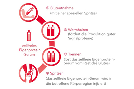 Dabei ist das Vorgehen denkbar einfach: Der Arzt bereitet mit Spezialspritzen von Orthokine®, Blut aus einer Vene des Patienten zu einem zellfreien Serum auf. Mit diesem autologen Serum werden erhöhte Mengen an anti-inflammatorischen Zytokinen und Wachstumsfaktoren gewonnen, welche – gezielt injiziert – positiv in die Entzündungs- und Schmerzprozesse eingreifen. Wachstumsfaktoren wirken regenerativ und können den weiteren Knorpelabbau verzögern oder sogar stoppen.