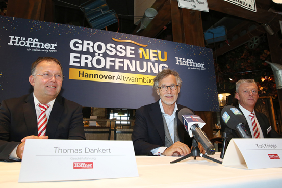 Anlässlich einer Pressekonferenz am Dienstag meinte Höffner-Eigner Kurt Krieger, dessen Gesamt-Unternehmen mit über 10000 Mitarbeitern schon mehrfach für besondere Service-Qualität ausgezeichnet wurde: „Unsere Eröffnung in Hannover hat eine 15 Jahre lange Vorgeschichte. Nach einigen Baugrenz-Problemen sind wir jetzt froh, mit Hilfe der sehr kooperativen Gemeinde Altwarmbüchen einen weiteren weißen Fleck in der Möbel-Landschaft der Orte bebaut zu haben, der uns zur bundesweiten Präsenz noch fehlt. Stolz macht mich die Tatsache, dass wir auch in Hannover mit Handwerkern vor Ort arbeiten, besonders, was unsere Kernkompetenz betrifft – den Küchenaufbau. Zudem, dass wir mit Hilfe der Agentur für Arbeit im Job-Center über 50 Prozent unserer Mitarbeiter aus der Arbeitslosigkeit holen und schulen konnten und dass ein Viertel unserer Mitarbeiter über 50 Jahre alt ist.“