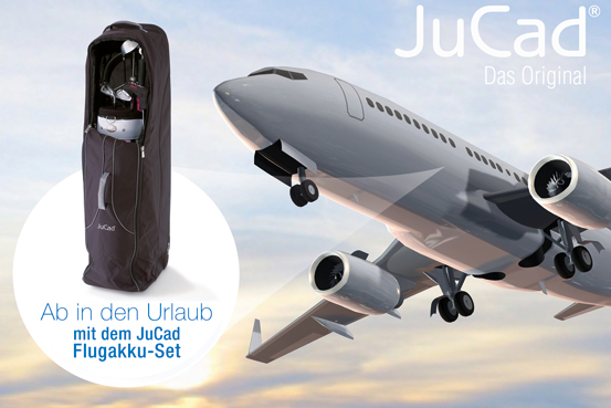 - Mit einer Ausnahme: Die Mitnahme von Lithium-Ionen-Akkus auf Flügen hängt von den jeweiligen Beförderungsbestimmungen ab. Dabei gibt es häufig Änderungen in den Vorgaben der Wattstunden (Wh), die ein Lithium-Ionen-Akku haben darf (bisher 160 Wh, aktuell 100 Wh). JuCad bietet seinen Kunden – zusätzlich zu dem Standard-Hochleistungsakku – ein Flugakku-Set mit je 2 x 95 Wh an.