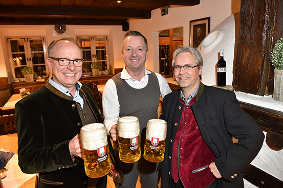 Karl-Heinz Zacher, die Hauseigner Dr. Jobst Kayser-Eichberg sowie deren Vorstände Martin Schuhmacher und Michael Heubach, Andreas Bollow und Dietmar Seiler von der Spatenbrauerei erhielten dafür noch beim Stehempfang in der Küche großen Applaus, u.a. von St. Emmeram-Nachbar und Ex-Hochspringer Carlo Thränhard (der nach 33 Jahren immer noch den deutschen Hallenrekord mit 2,42 m hält und von seinem 22jährigen Sohn Dion begleitet wurde), Sybille Beckenbauer (die eigens aus Kitzbühel kam), der Moderatorin Eva Grünbauer sowie Aston Martin München-Geschäftsleiter Wolfgang Oswald, der als Technik-Fan staunte: „Herrlich: Die Emmeramsmühle schaut innen aus wie früher, aber es ist ein gutes Gefühl, dass hinter der traditionellen bayrischen Gemütlichkeit modernste Technik steckt!“