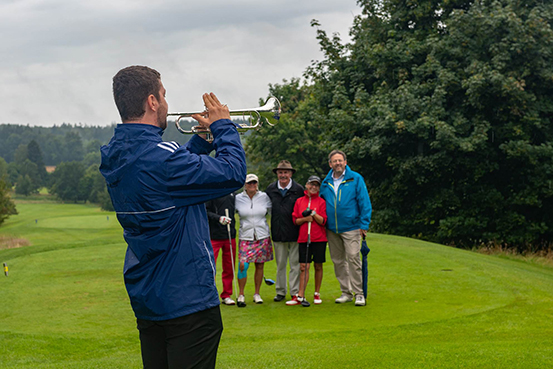 Eine hübsche Harfenistin am 4. Abschlag, eine geniale Geigerin am 10. oder zwei professionelle Posaunisten „kommentierten" die Schläge der Golfer treffend musikalisch - bei guten Schlägen mit Jubel-Rhythmen, bei weniger guten mit tröstenden… aber immer mit einer Prise Humor! Ansporn und Herausforderung zugleich, wann sonst bekommt man schon mal mit einem Triumphmarsch von Blechbläsern „oben“ verkündet, dass man z.B. auf der Bahn 16 von „unten“ das Grün getroffen hat?