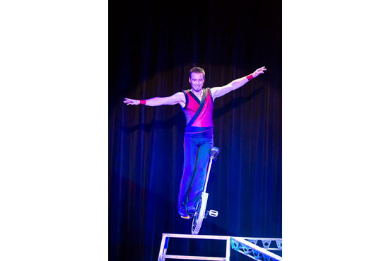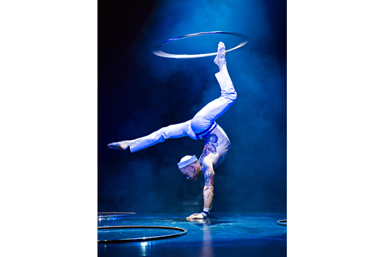 Apropos Spencer: Der attraktive 23-jährige Kanadier Spencer Craig macht Akrobatik am Luftring, eigentlich eine Domäne der Damen wie auch die Hula-Hoop-Reifen, die Tigris auf verblüffende Weise mit maskuliner Kontorsion kombiniert. Ein Sieg über die Gravitation: Der Auftritt des ukrainischen Duos Vladimir. Die beiden beeindrucken buchstäblich auf des Messers Schneide, per Handstand, kopfüber nach oben, jeder hält einen Dolch mit dem Mund am Griff fest. Am Ende der Nummer balanciert der Obere nur noch auf den Klingenspitzen.