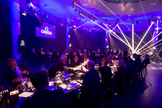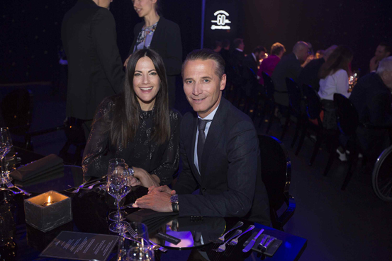 Alle Gäste hatten die Möglichkeit, in die Welt der Speedmaster einzutauchen, denn auf interaktiven Stationen wurde die Geschichte der Uhr dargestellt. Des Weiteren hatte International Brand Heritage Manager Petros Protopapas zwölf historische Zeitmesser aus dem OMEGA Museum in Biel mitgebracht. Nachdem gegen 20:30 Uhr der Countdown der Apollo XI-Rakete erklungen war, wurde der Innenteil der Location enthüllt, und die Gäste konnten unter der beeindruckenden Mondprojektion an langen Tischen Platz nehmen. Moderatorin Tanja Bülter stellte OMEGA Präsident Raynald Aeschlimann vor (im Foto mit Bettina Zimmermann). Der Omega CEO erklärte: „Es ist wundervoll, dass unsere ikonische Uhr auch nach 60 Jahren immer noch so viele Menschen inspiriert und begeistert. Die Speedmaster ist eine ganz besondere Uhr mit einem ungewöhnlichen Erbe von dem ich immer Stolz berichte. Ich freue mich, in diesem zauberhaften Setting der Speedmaster meine Ehre zu erweisen."