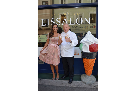 Das fesche "Wiesn-Eis"-Model Nina (im Seidenbrokat-Dirndl „Purple Angels“ mit Svarowski-Steinen von Münchens Edel-Designerin Anja Ziller) kostete Schuhbecks Eis-Kreation schon mal vor: „Traumhaft! Man merkt, dass sich Alfons Schuhbeck mit den Früchten der Saison etwas Besonderes einfallen ließ. Und er hat mir versichert, dass er nie und nimmer ein Weißwurst-Eis machen würde. Er ist halt bodenständig geblieben…“