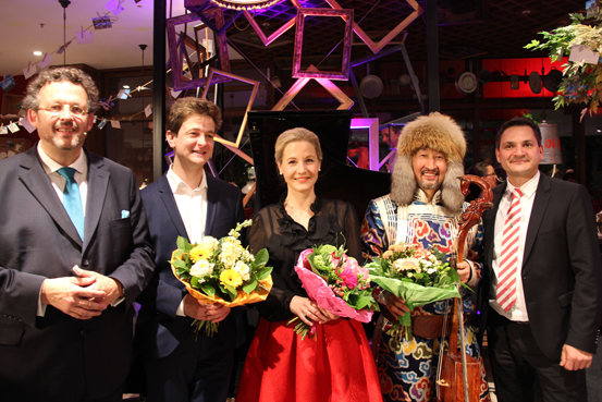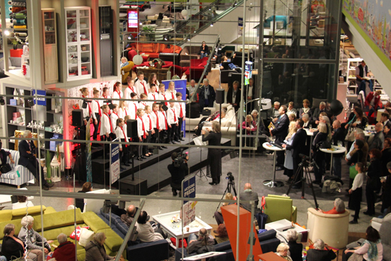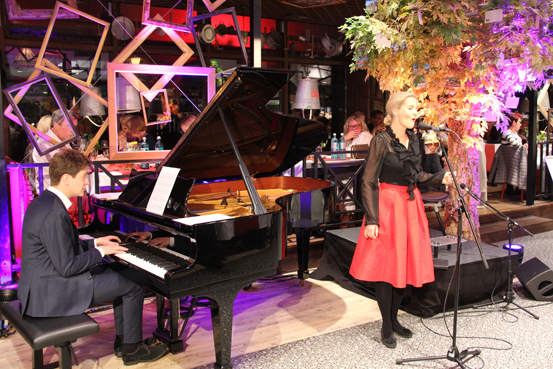 Die Gäste wurden zunächst beim Aperitif vom Kinderchor der Bayerischen Philharmonie unter der Leitung von Kirsten Döring-Lohmann auf die musikalischen Genüsse des Abends eingestimmt. Anschließend gab es im edel gedeckten Restaurant „Kochmütze“ des Möbelhauses abwechselnd musikalische und kulinarische Zwischengänge.